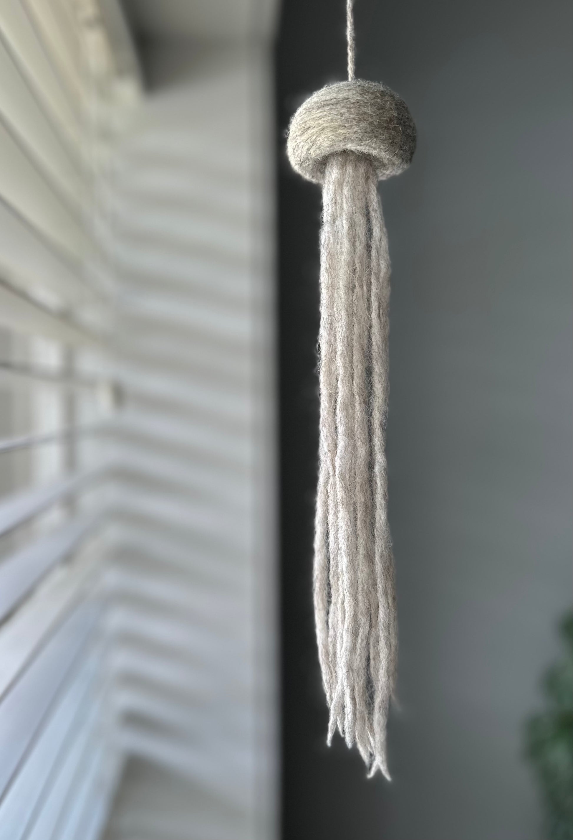 Wooly Jellies are felted with 100% wool. Each one has its own unique shape. Jellies hang nicely in a window or anywhere they can catch a little breeze, giving all the light, airy, calming feels.
