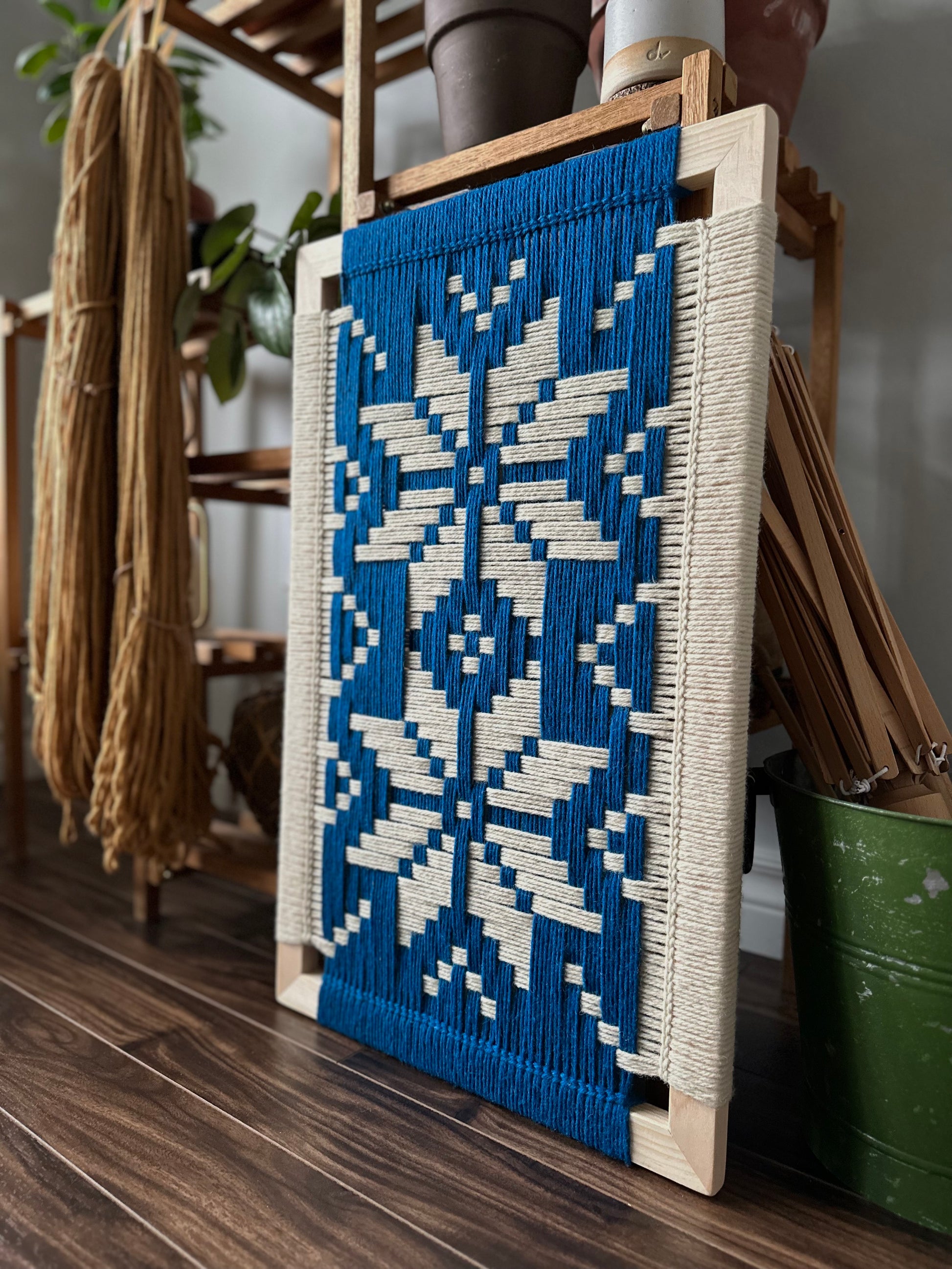 Your frame weave does NOT require hanging hardware. A simple raised thumbtack will do the trick. Lay the back edge of your weave on the tack, then shift until level. The tack will be hidden.